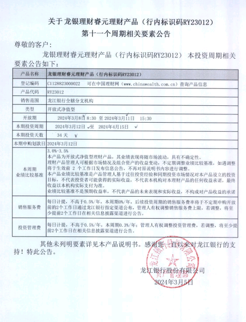 关于龙银理财睿元理财产品(行内标识码RY23012)第十一个周期相关要素公告