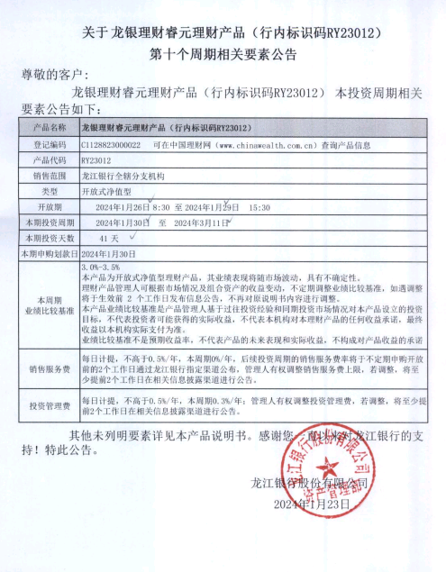 关于龙银理财睿元理财产品(行内标识码RY23012)第十个周期相关要素公告