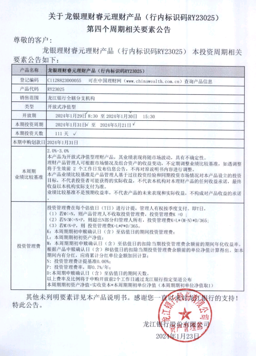 关于龙银理财睿元理财产品(行内标识码RY23025)第四个周期相关要素公告