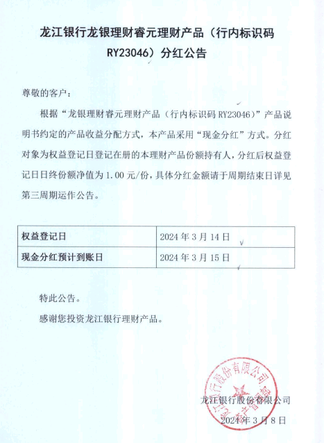 龙江银行龙银理财睿元理财产品(行内标识码RY23046)分红公告