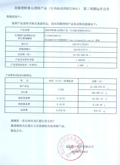 龙银理财睿元理财产品(行内标识码RY23041)第三周期运作公告