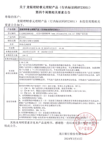 龙银理财睿元理财产品(行内标识码RY23051)第四个周期相关要素公告