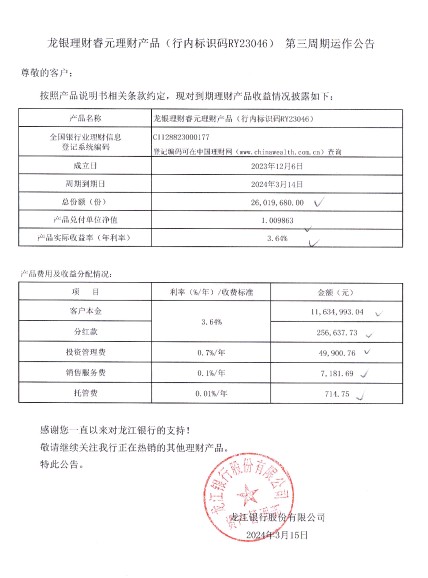 龙银理财睿元理财产品(行内标识码RY23046)第三周期运作公告