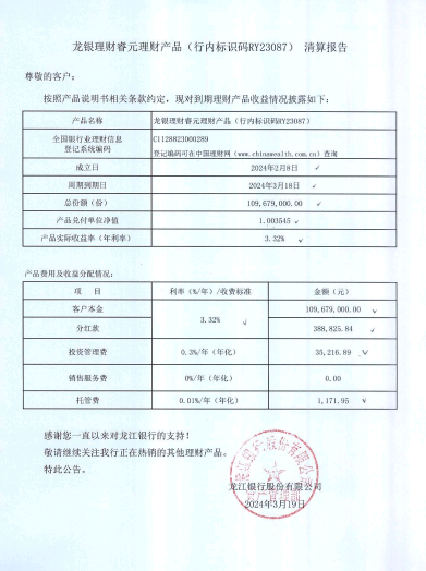 龙银理财睿元理财产品(行内标识码RY23087)清算报告