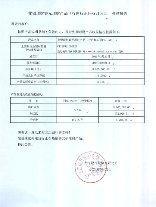 龙银理财睿元理财产品(行内标识码RY21036)清算报告