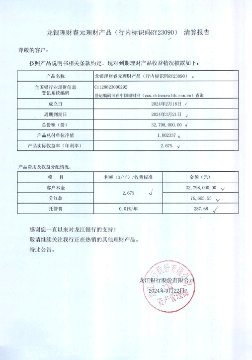 龙银理财睿元理财产品(行内标识码RY23090)清算报告