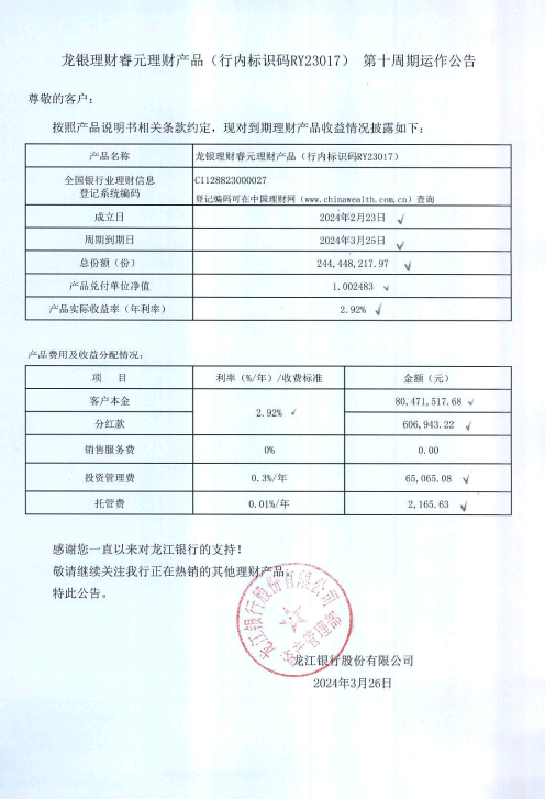 龙银理财睿元理财产品(行内标识码RY23017)第十周期运作公告