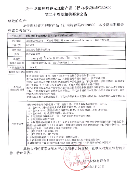 关于龙银理财睿元理财产品(行内标识码RY23080)第二个周期相关要素公告
