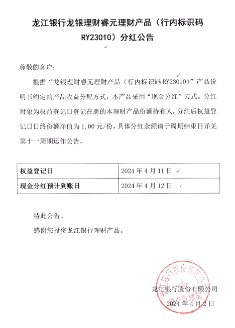 龙江银行龙银理财睿元理财产品(行内标识码RY23010)分红公告