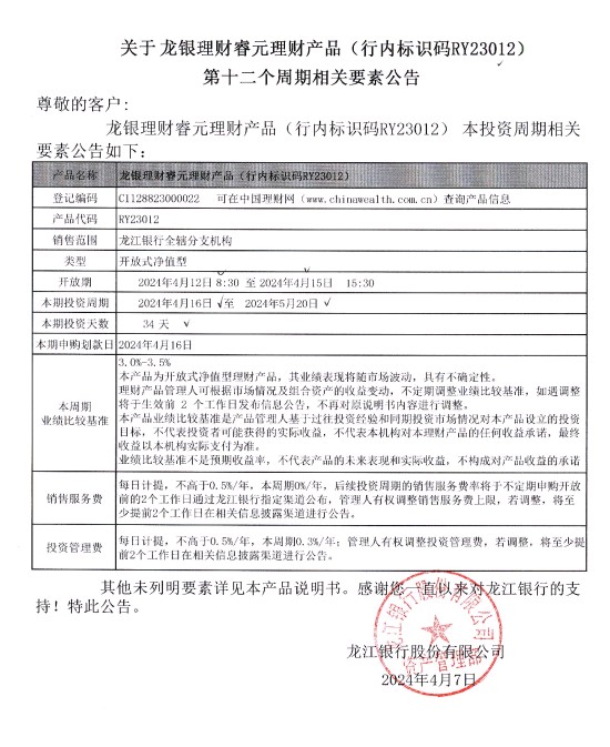 龙银理财睿元理财产品(行内标识码RY23012)第十二个周期相关要素公告