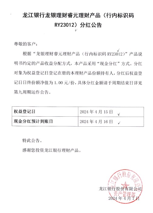 龙江银行龙银理财睿元理财产品(行内标识码RY23012)分红公告