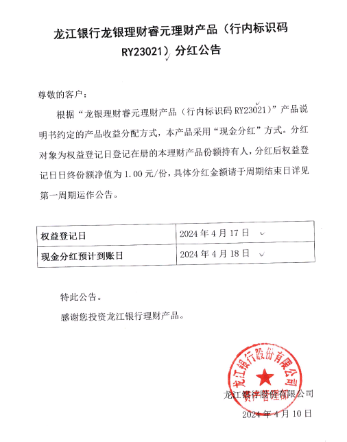 龙江银行龙银理财睿元理财产品(行内标识码RY23021)分红公告