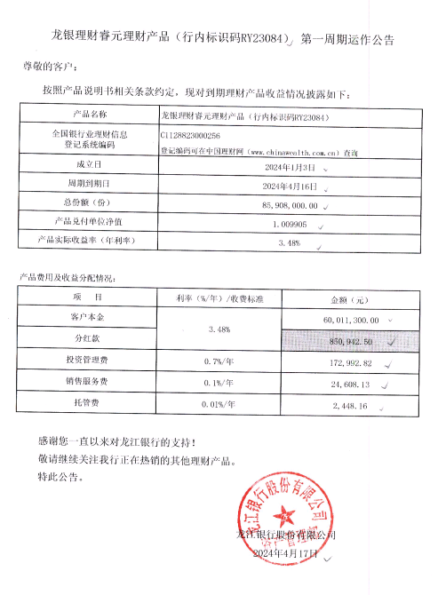 龙银理财睿元理财产品(行内标识码RY23084)第一周期运作公告