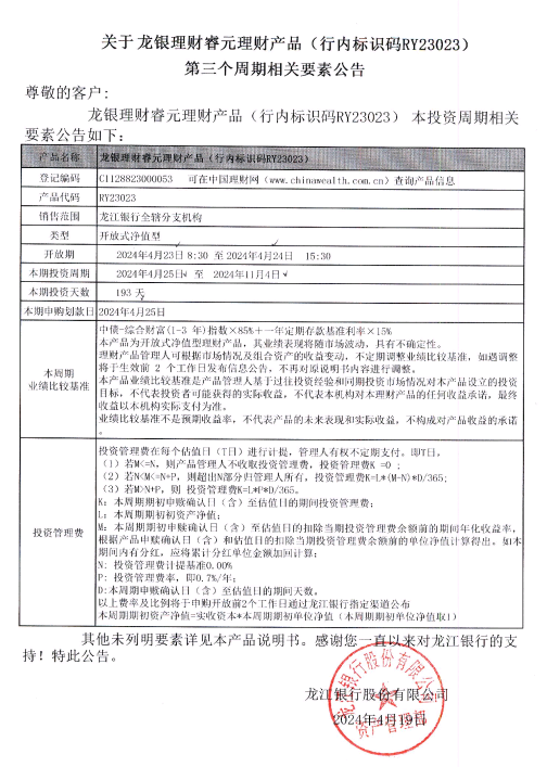 龙银理财睿元理财产品(行内标识码RY23023)第三个周期相关要素公告