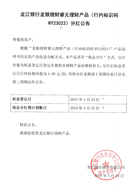 龙江银行龙银理财睿元理财产品(行内标识码RY23023)分红公告