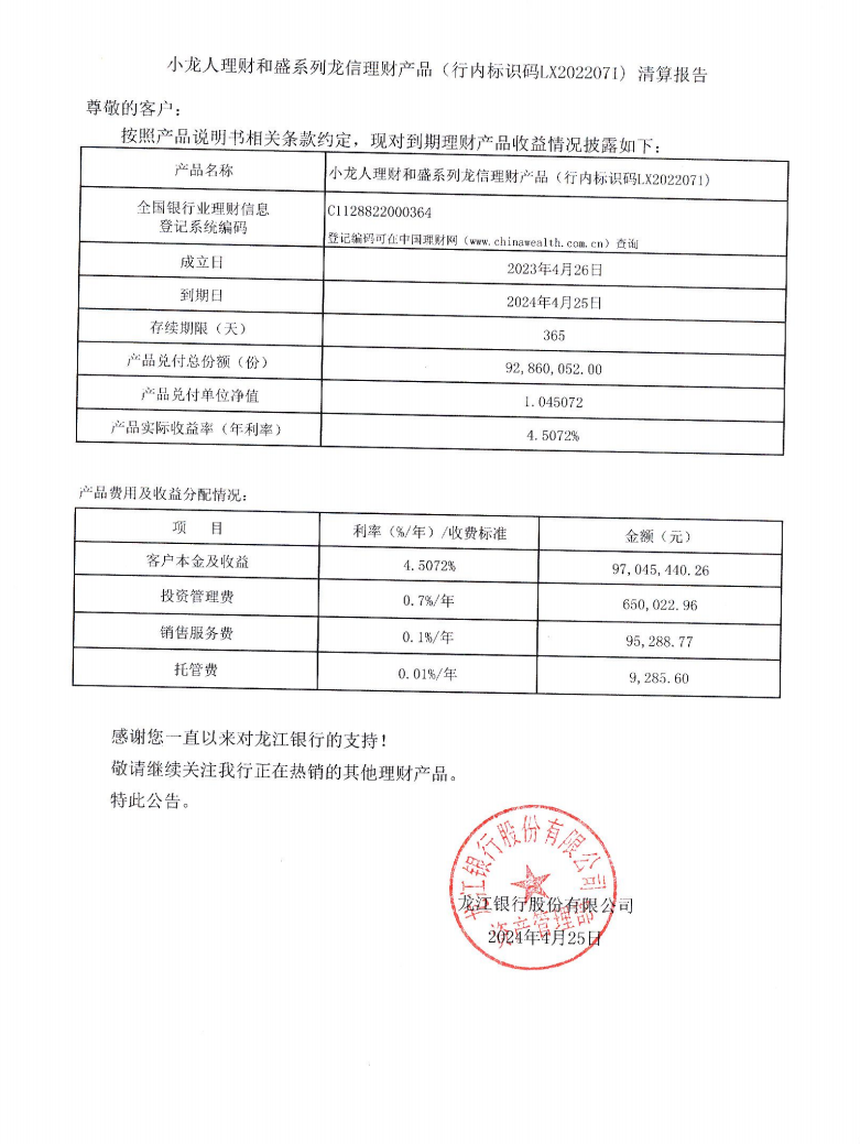 20240425小龙人理财和盛系列龙信理财产品(行内标识码LX2022071)清算报告