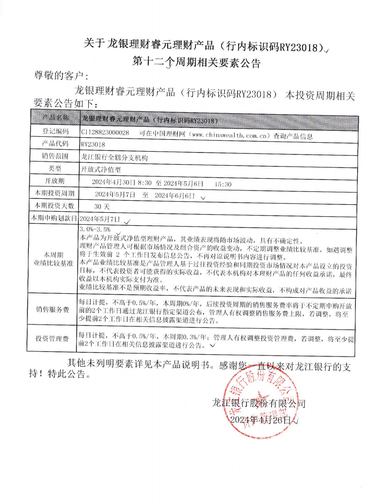 关于龙银理财睿元理财产品(行内标识码RY23018)第十二个周期相关要素公告