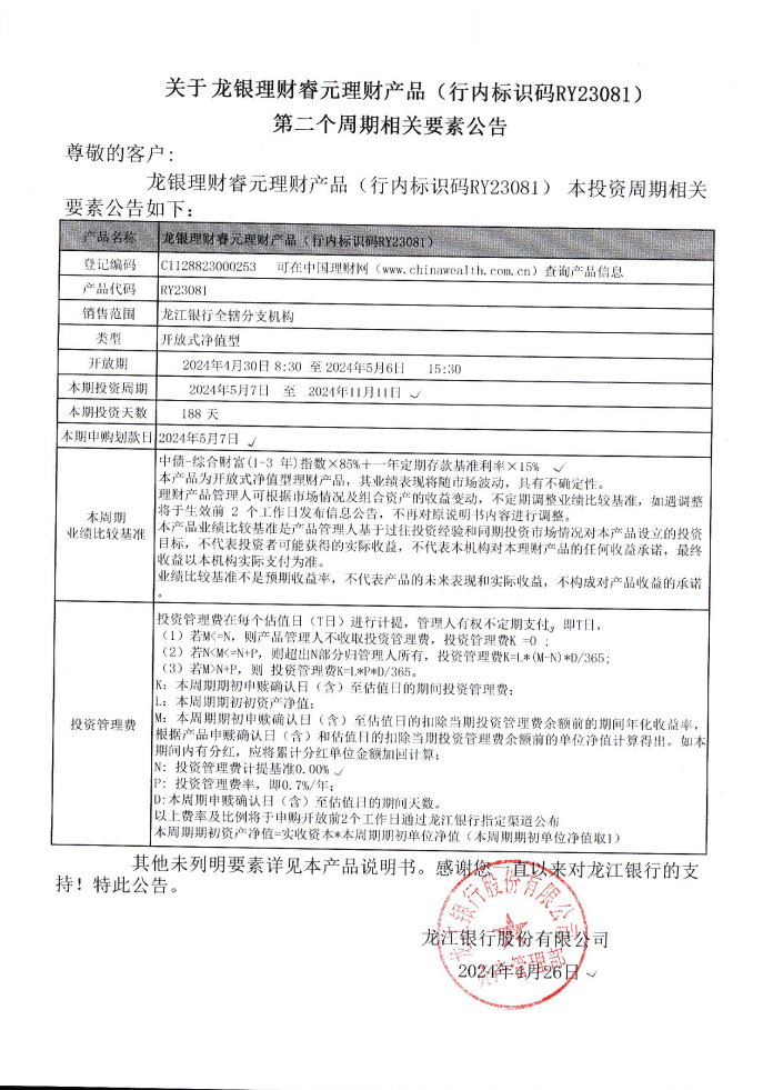 关于龙银理财睿元理财产品(行内标识码RY23081)第二个周期相关要素公告
