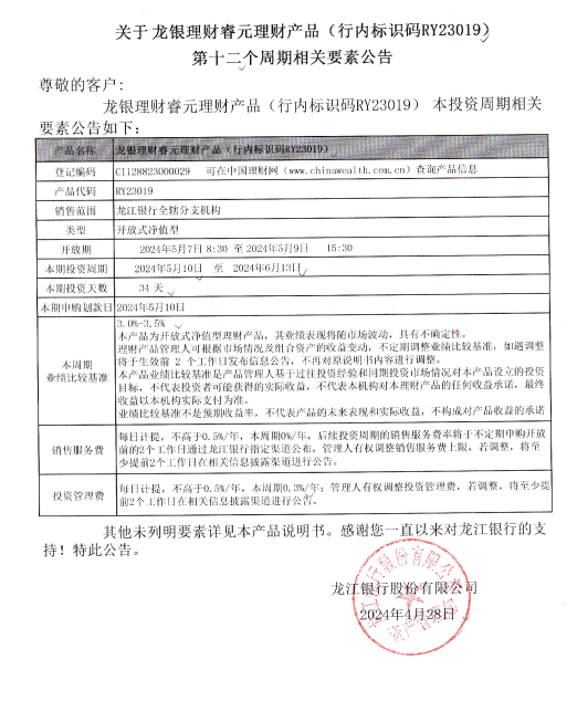 龙银理财睿元理财产品(行内标识码RY23019)第十二个周期相关要素公告