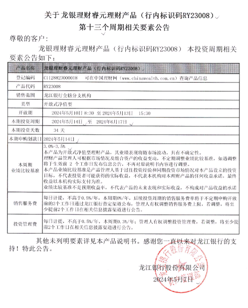 关于龙银理财睿元理财产品(行内标识码RY23008)第十三个周期相关要素公告