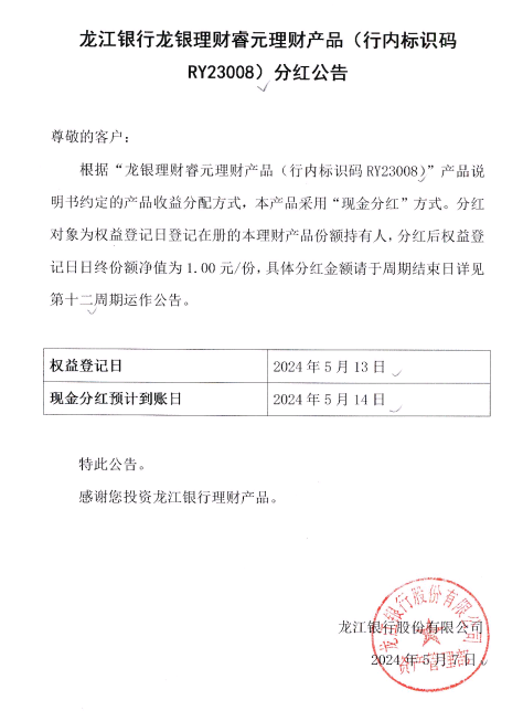 龙江银行龙银理财睿元理财产品(行内标识码RY23008)分红公告