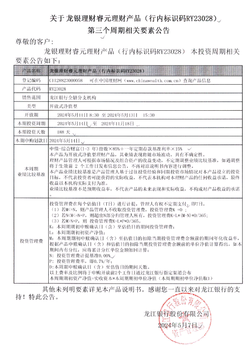 关于龙银理财睿元理财产品(行内标识码RY23028)第三个周期相关要素公告