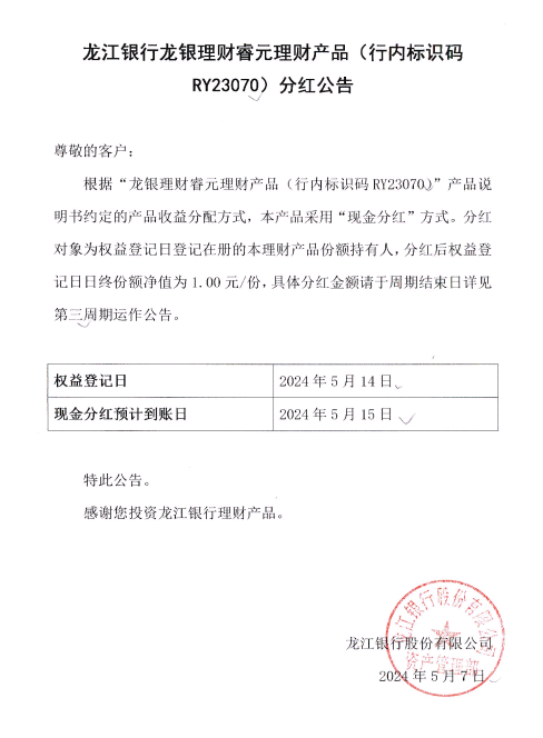 龙江银行龙银理财睿元理财产品(行内标识码RY23070)分红公告