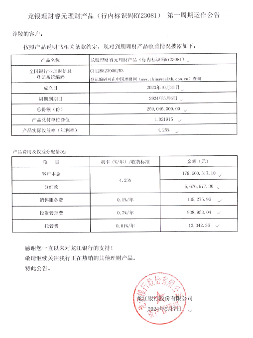龙银理财睿元理财产品(行内标识码RY23081)第一周期运作公告