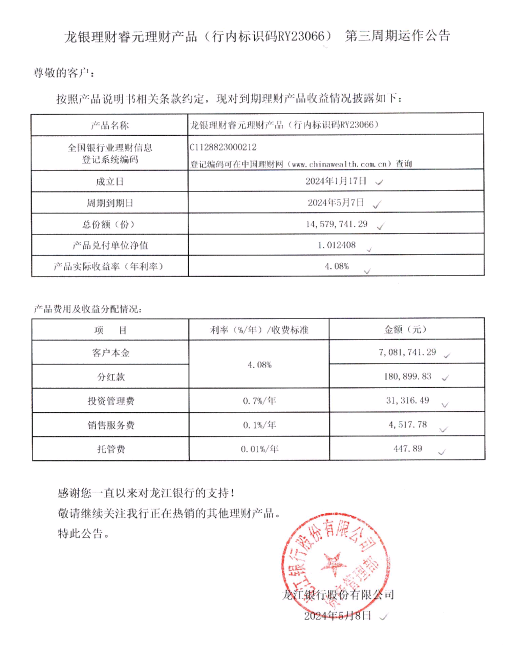 龙银理财睿元理财产品(行内标识码RY23066)第三周期运作公告