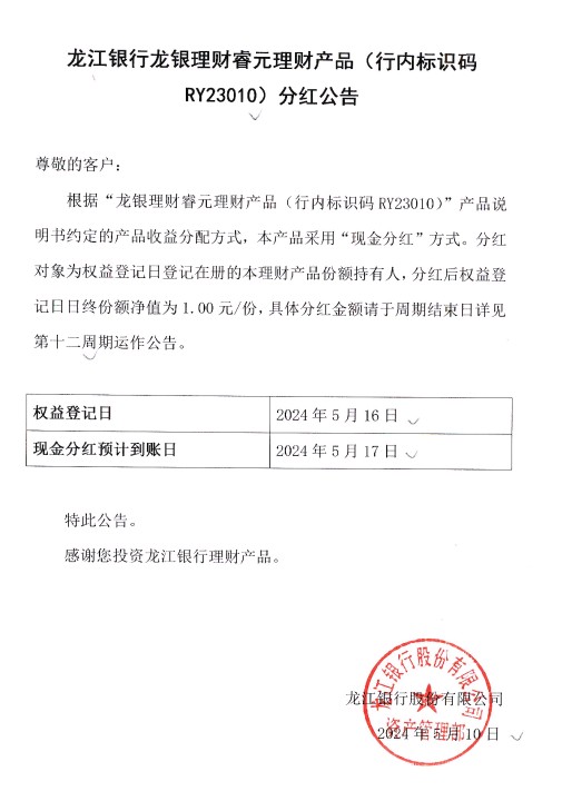 龙江银行龙银理财睿元理财产品(行内标识码RY23010)分红公告
