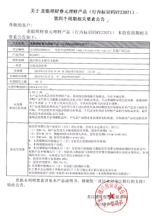 龙银理财睿元理财产品(行内标识码RY23071)第四个周期相关要素公告