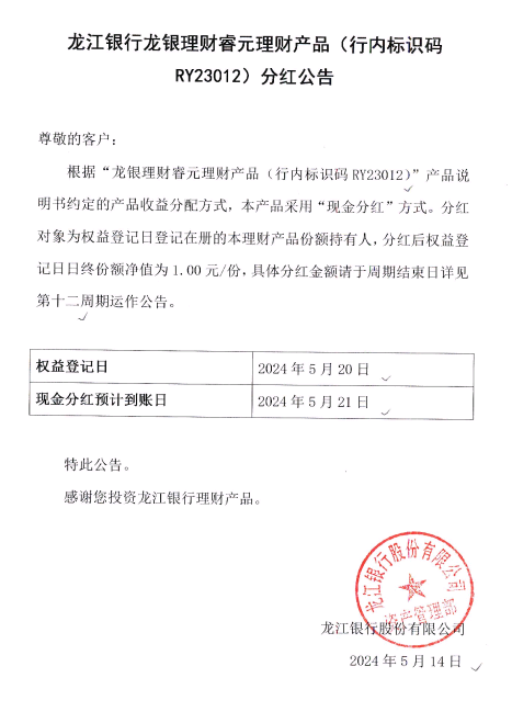 龙江银行龙银理财睿元理财产品(行内标识码RY23012)分红公告
