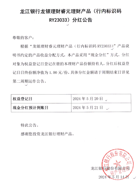 龙江银行龙银理财睿元理财产品(行内标识码RY23033)分红公告