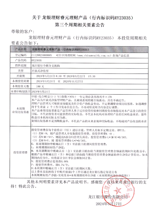 关于龙银理财睿元理财产品(行内标识码RY23035)第三个周期相关要素公告