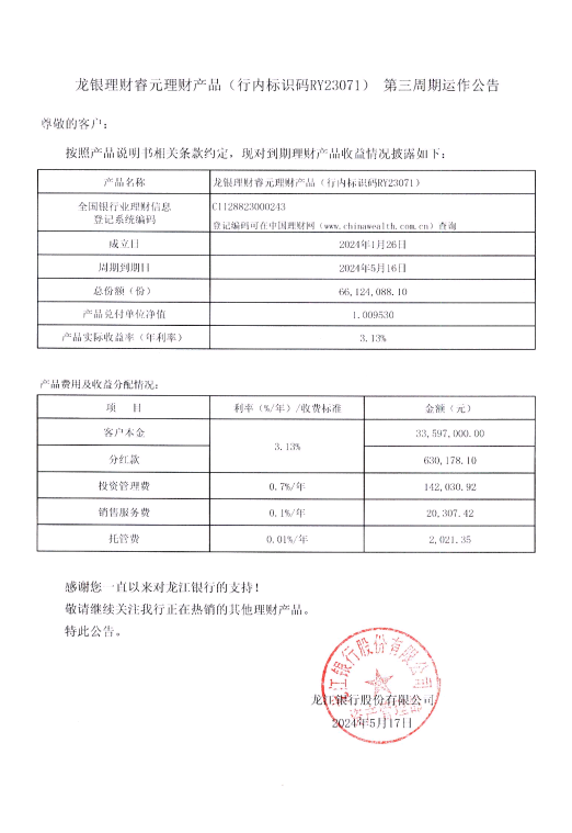 龙银理财睿元理财产品(行内标识码RY23071)第三周期运作公告