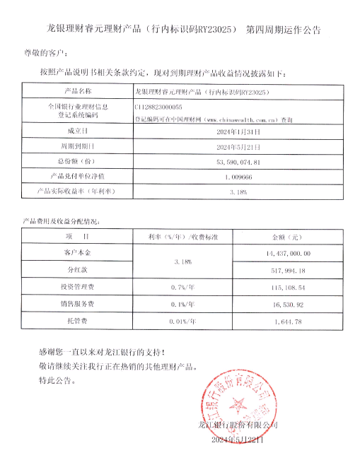 龙银理财睿元理财产品(行内标识码RY23025)第四周期运作公告
