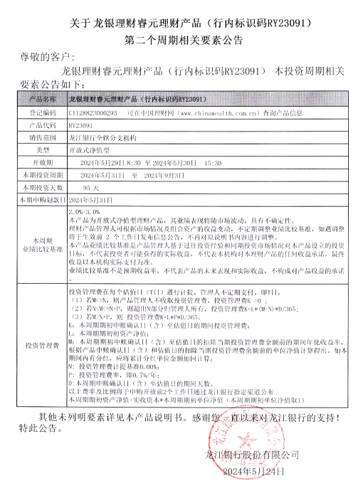 关于龙银理财睿元理财产品(行内标识码RY23091)第二个周期相关要素公告
