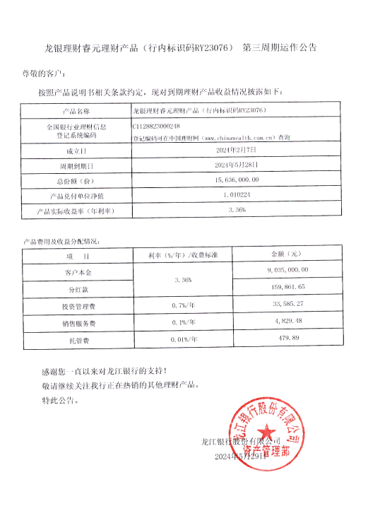 龙银理财睿元理财产品(行内标识码RY23076)第三周期运作公告