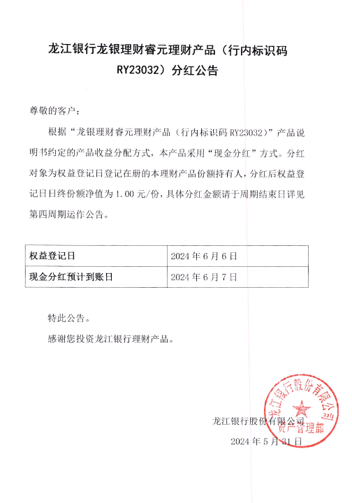 龙江银行龙银理财睿元理财产品(行内标识码RY23032)分红公告