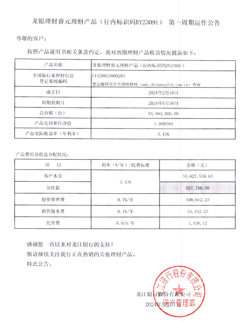 龙银理财睿元理财产品(行内标识码RY23091)第一周期运作公告