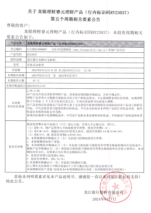 关于龙银理财睿元理财产品(行内标识码RY23037)第五个周期相关要素公告