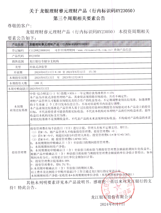 关于龙银理财睿元理财产品(行内标识码RY23050)第三个周期相关要素公告