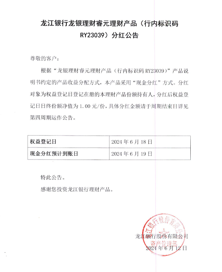 龙江银行龙银理财睿元理财产品(行内标识码RY23039)分红公告