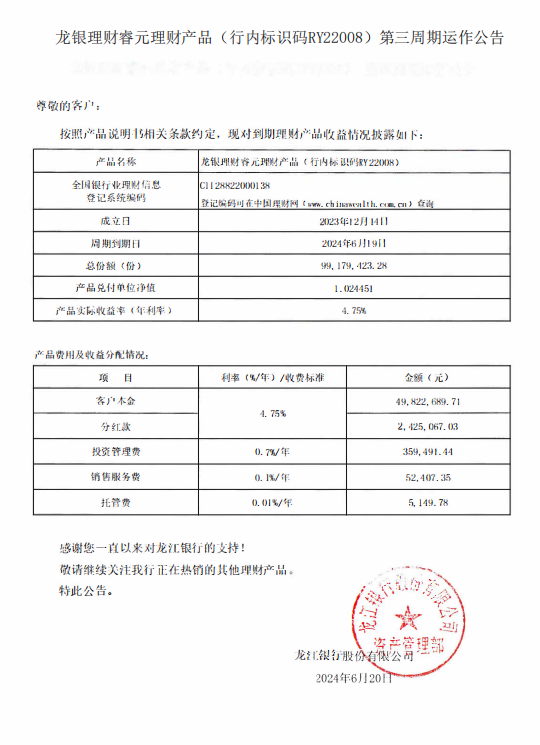 龙银理财睿元理财产品(行内标识码RY22008)第三周期运作公告