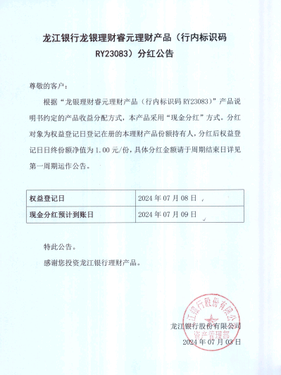 龙江银行龙银理财睿元理财产品(行内标识码RY23083)分红公告