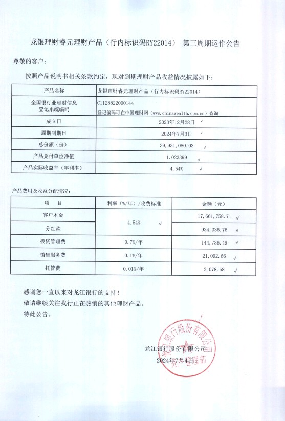 龙银理财睿元理财产品(行内标识码RY22014)第三周期运作公告