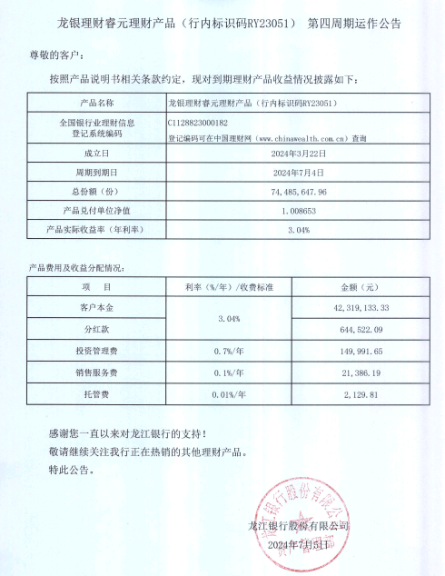 龙银理财睿元理财产品(行内标识码RY23051)第四周期运作公告