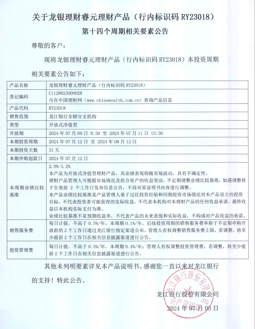 龙银理财睿元理财产品(行内标识码RY23018)第十四个周期相关要素公告