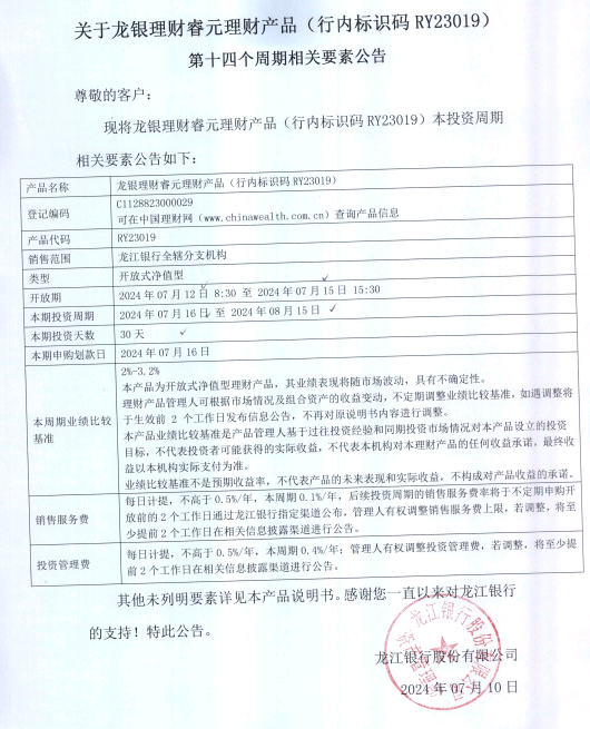 龙银理财睿元理财产品(行内标识码RY23019)第十四个周期相关要素公告