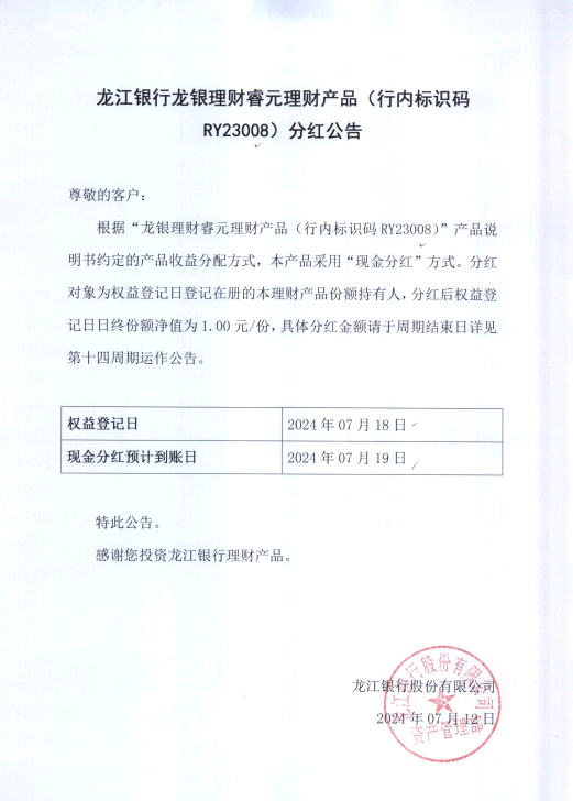 龙江银行龙银理财睿元理财产品(行内标识码RY23008)分红公告